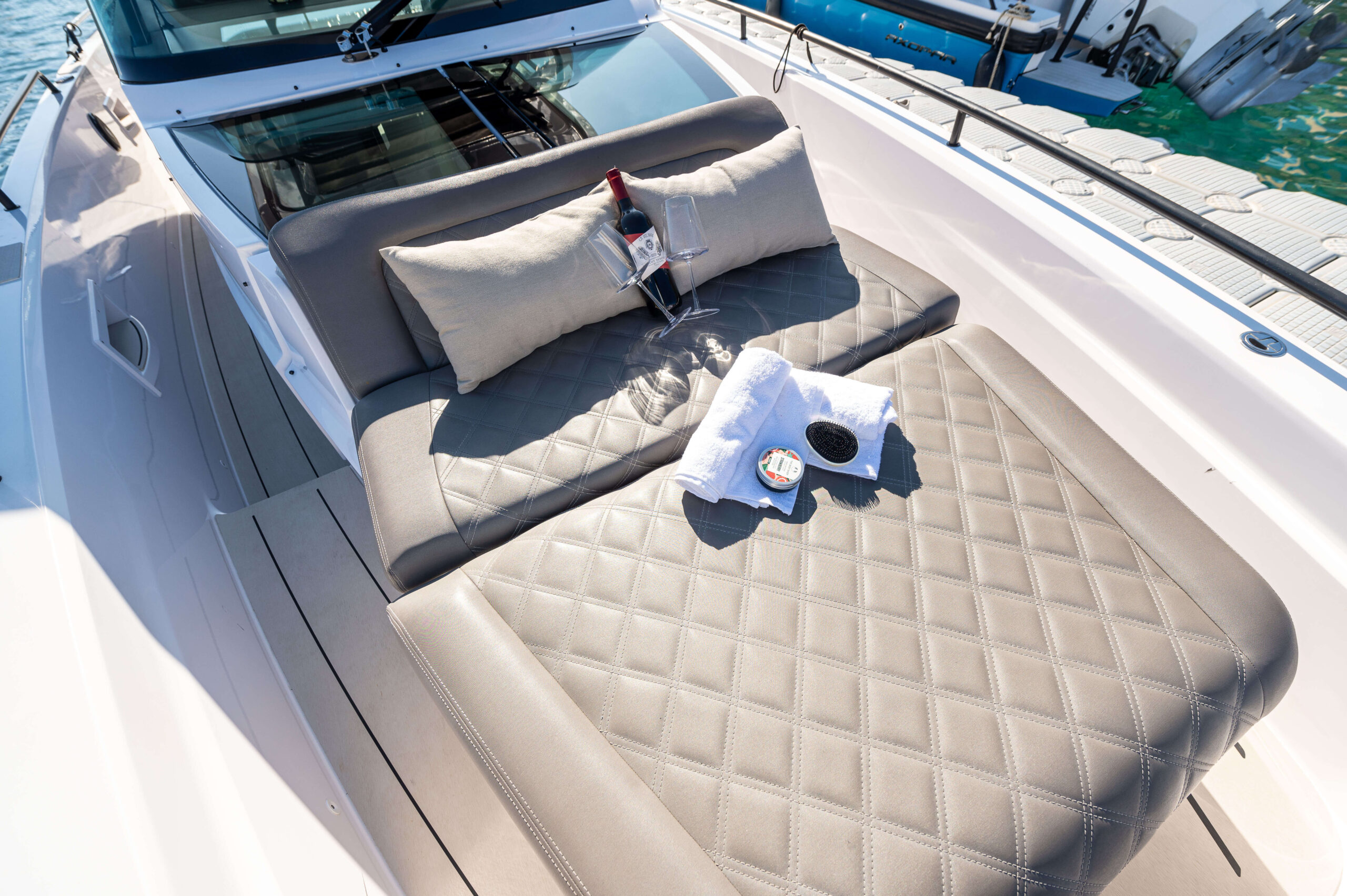 Fixed sunbed on front deck with storage, Silvertex Sterling
